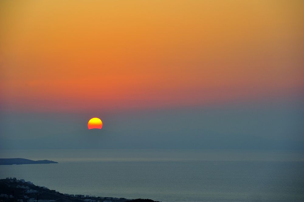 View: Western half Mykonos Island - The Aegean Sea and the islands of Syros, Paros, Naxos, Tinos and Delos - Sunset.