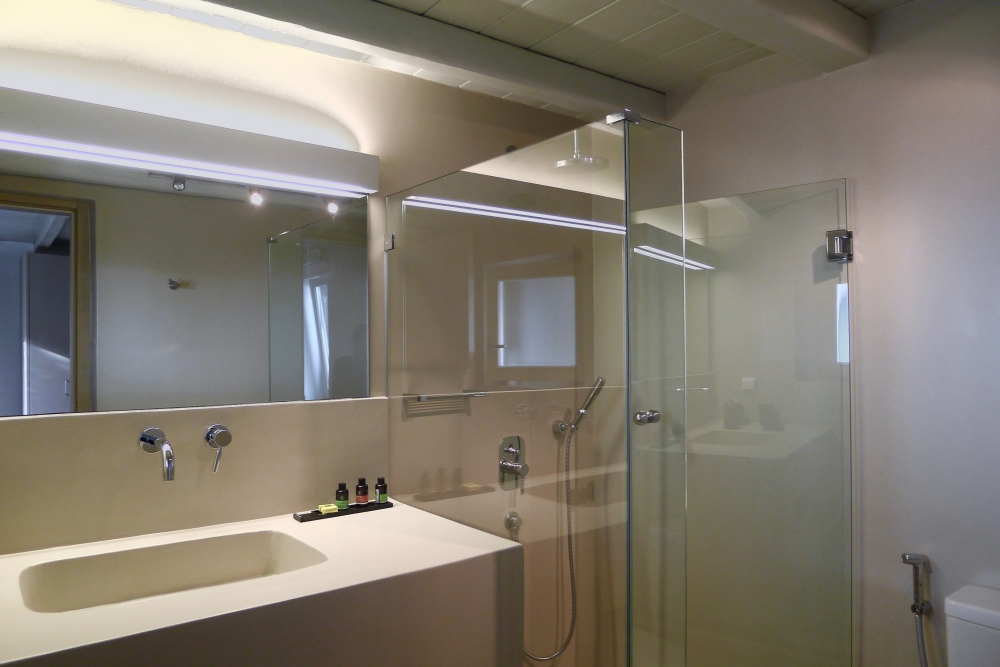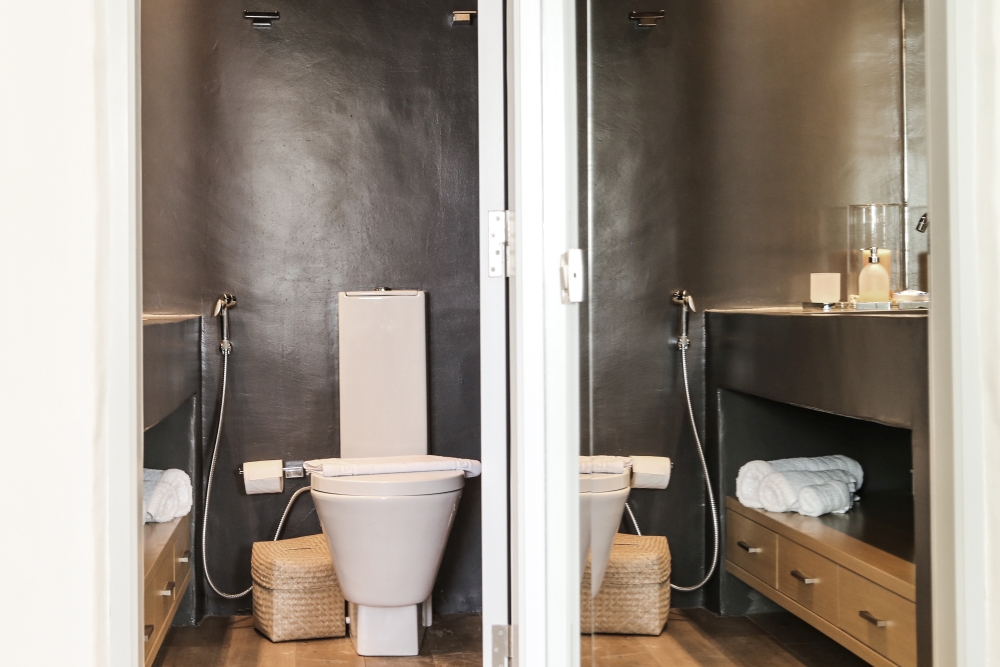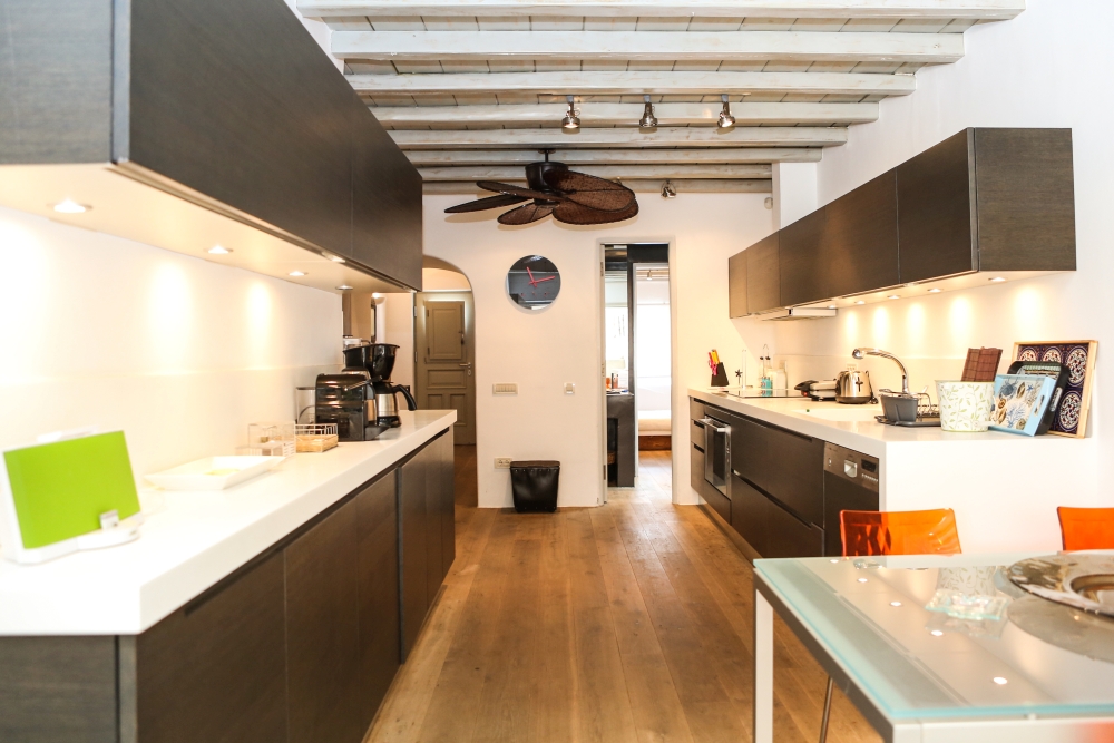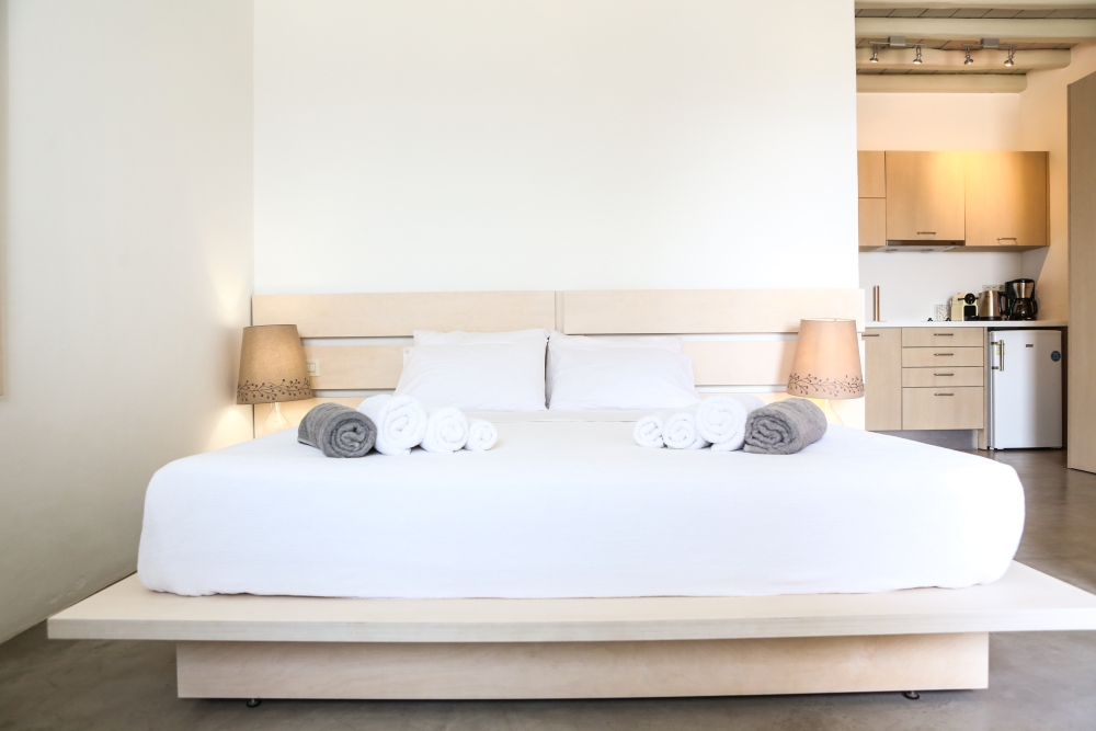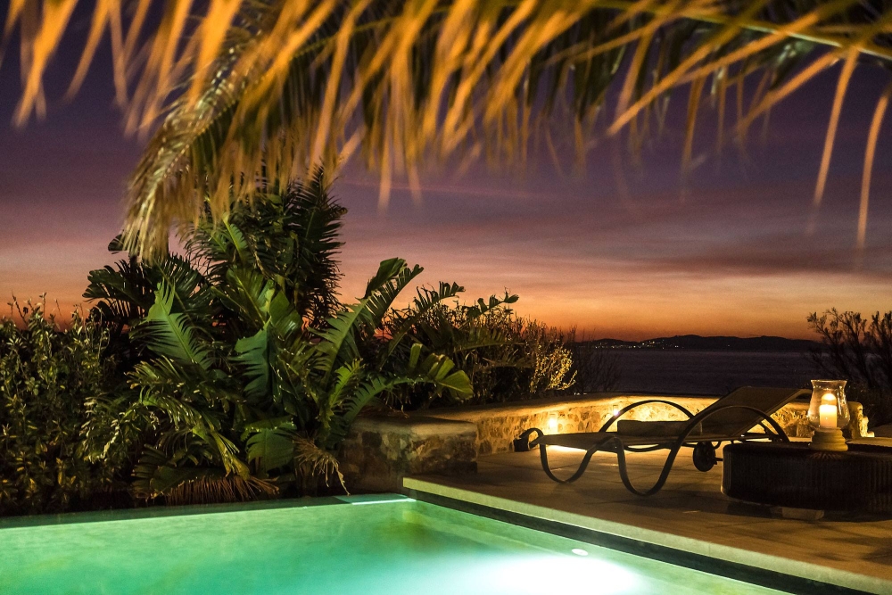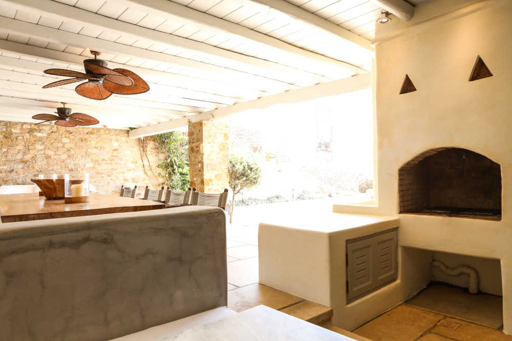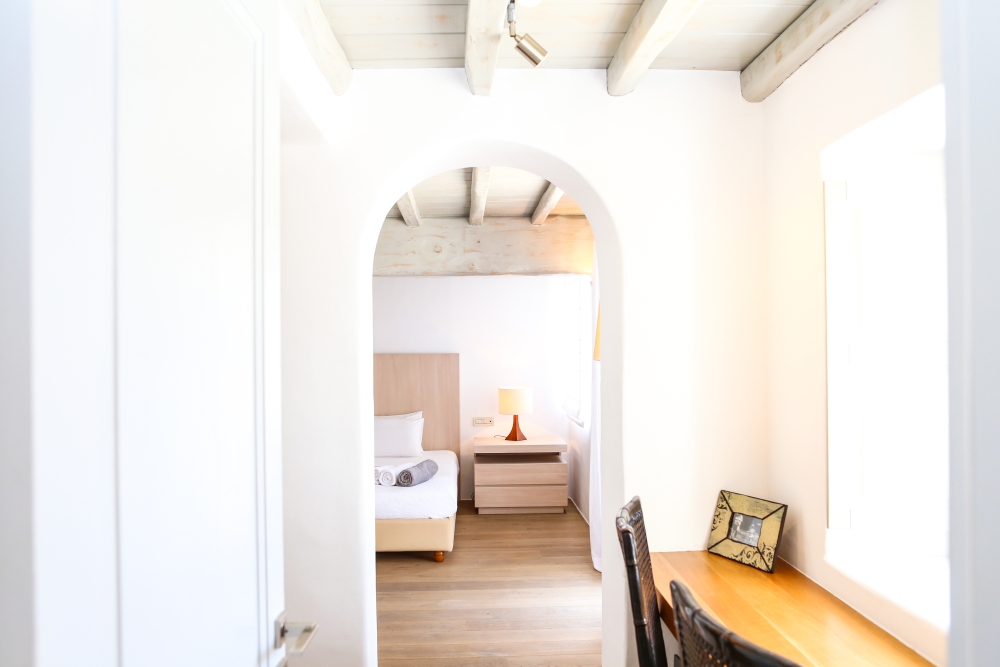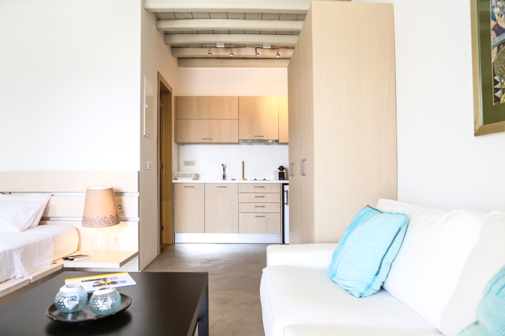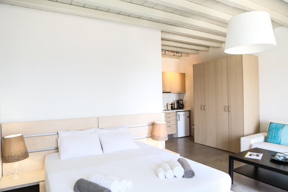 The outdoor areas are plentiful and apart from lounging by the pool amidst palm trees, one can also take a lazy afternoon nap in the hammock overlooking the ocean or play some footie or volleyball in the sandy court. Adding to this blissful enjoyment there is also a bar, a BBQ, and sufficient dining space under the shady pergolas, protecting you from the basking Greek sun.