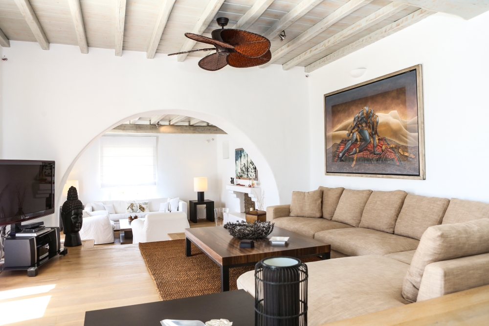 The proximity to town is ideal while the short step to the sandy beach of Agios Stefanos is an additional benefit. The views, overlooking the Aegean Sea and Mykonos Town in the distance, combined with the spacious, ornate and upscale architecture of this residence make it a first choice for many of our guests.