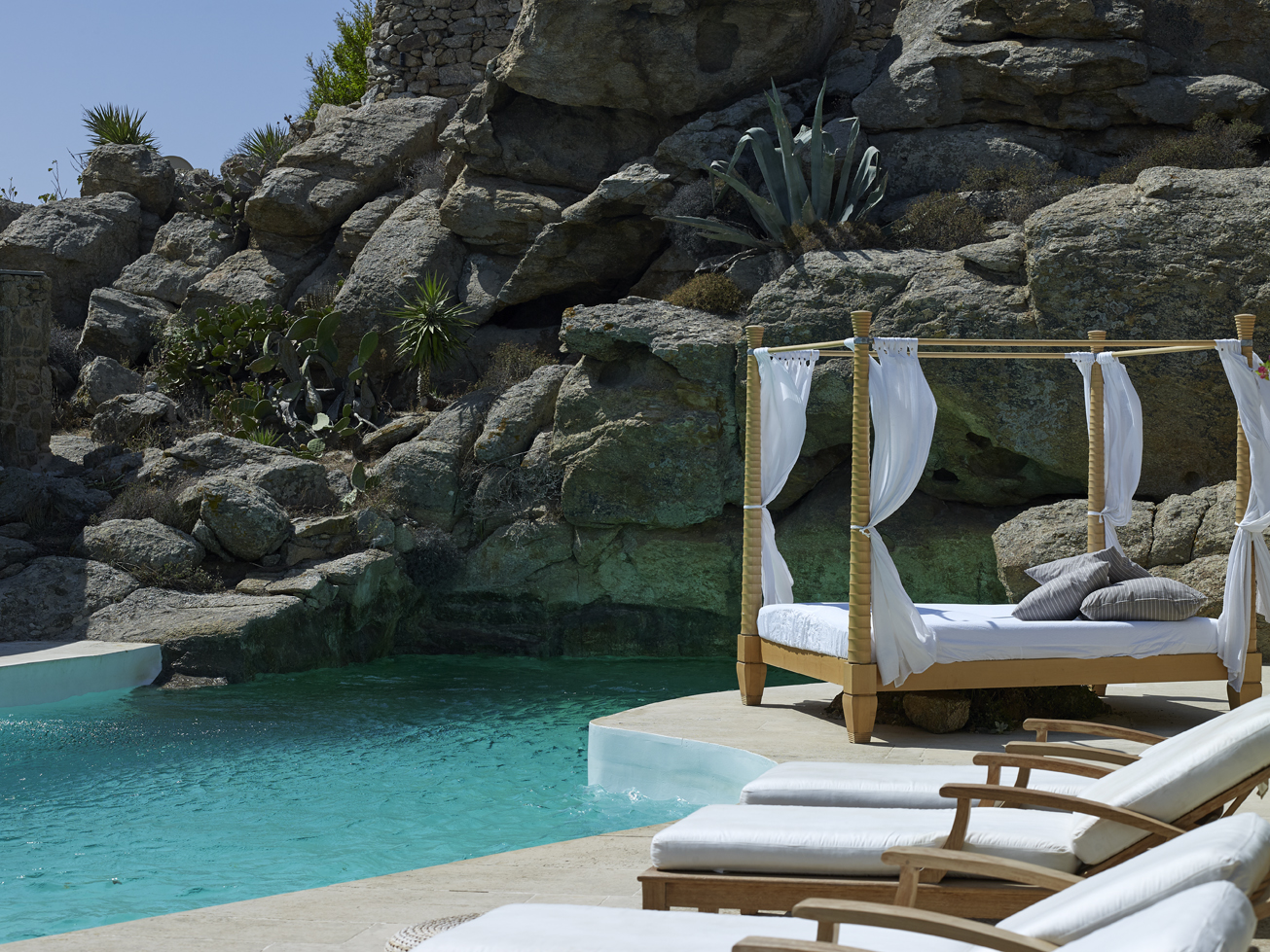 Villa Cassandra, facing south, lies uphill within a luxury estate of 10,000 m2 and is situated between Super Paradise and Paradise beach with undisturbed sea views of the Aegean Sea and Islands.