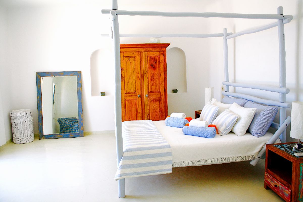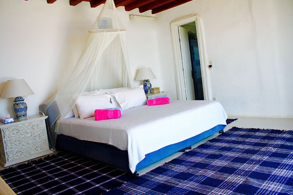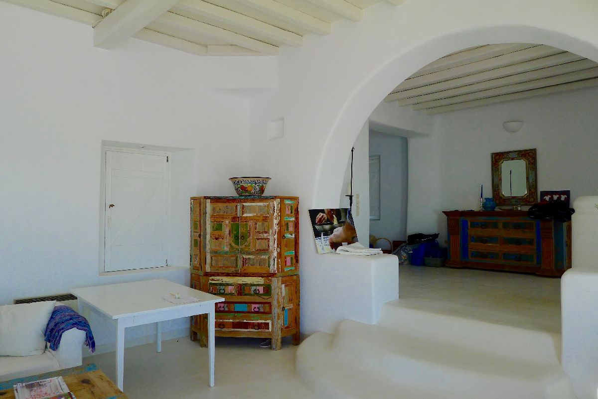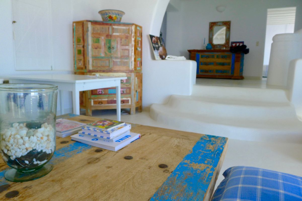 Cycladic archways and open, sunlit spaces welcomes you into the main living area which is characterized by a fine mixture of bohemian, free-spirited aesthetic, combined with Mykonos island blue and rustic Mexican style textiles.