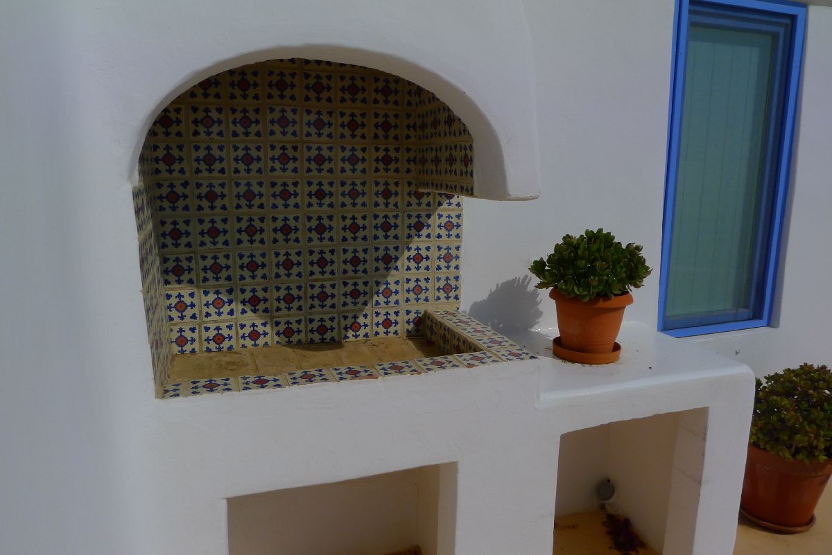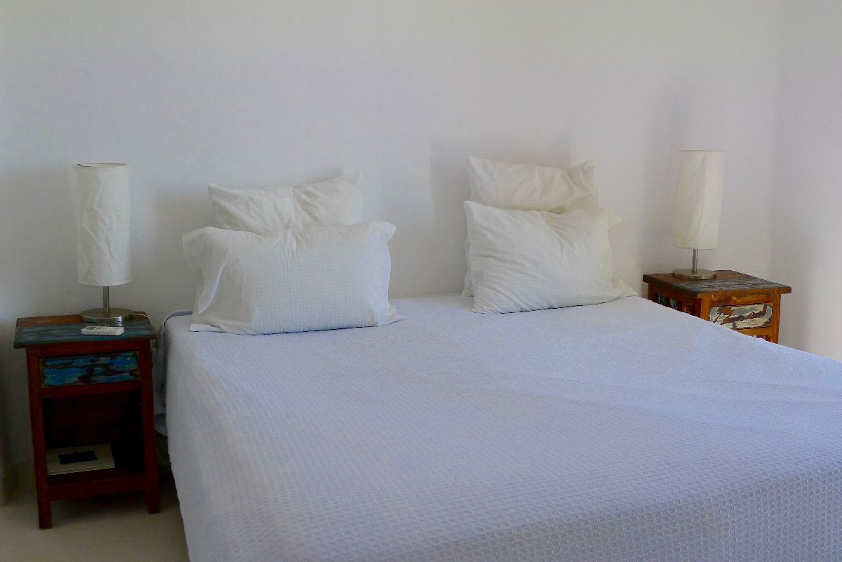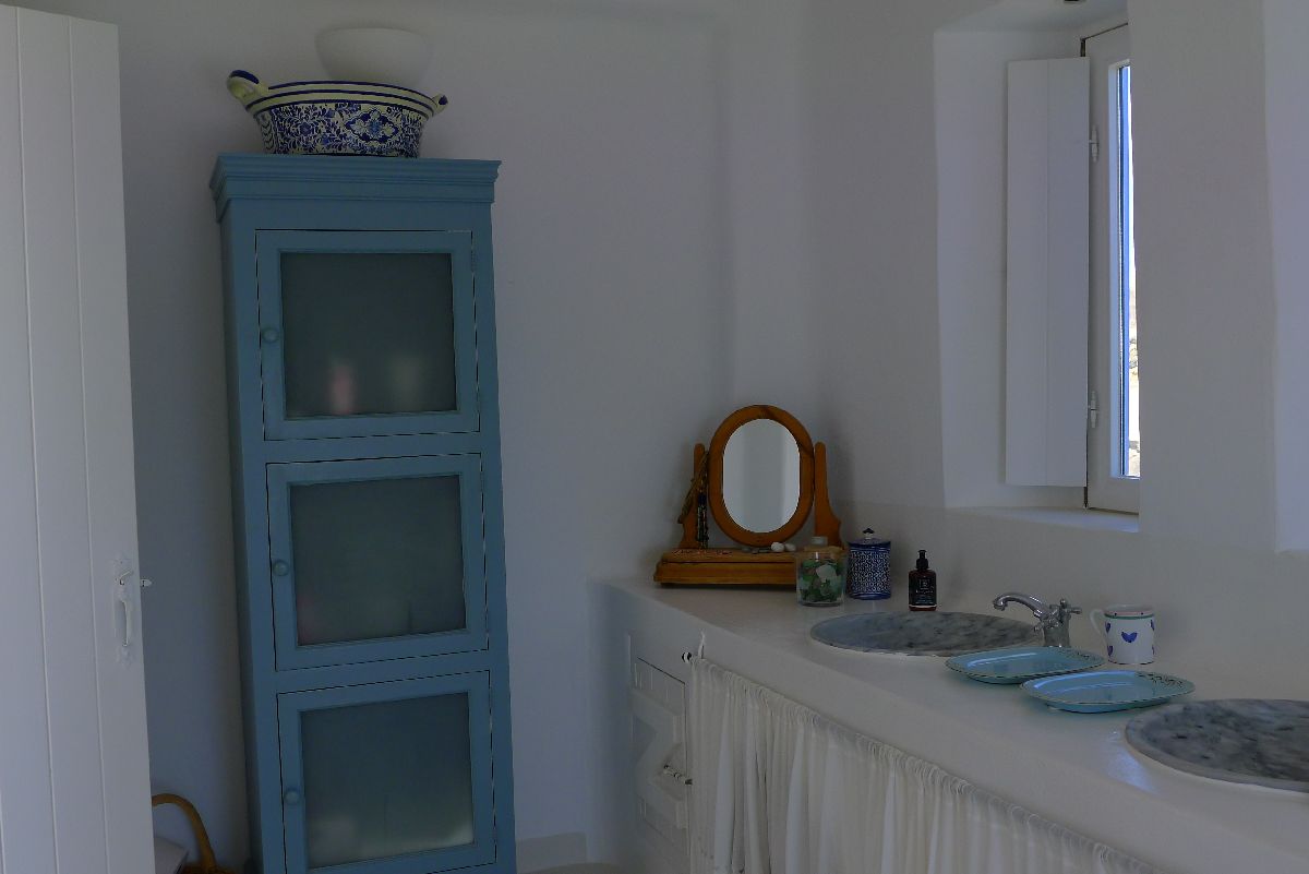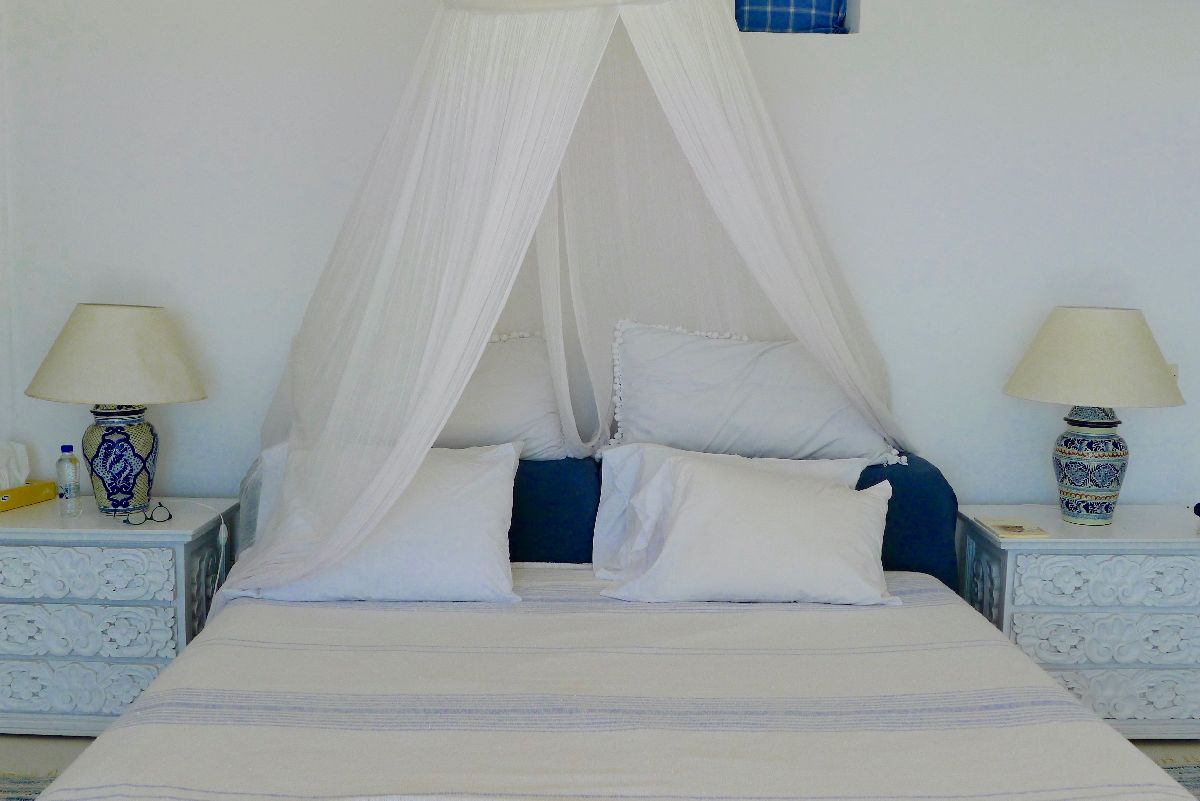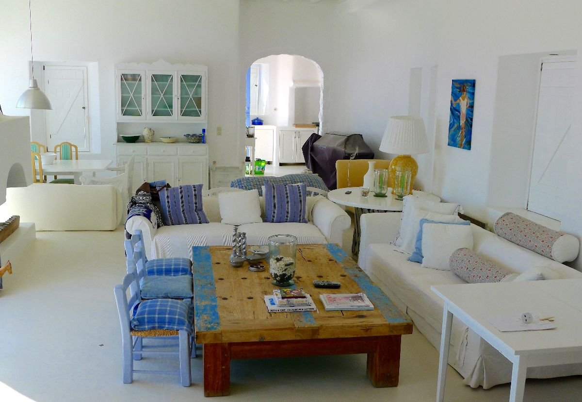 Cycladic archways and open, sunlit spaces welcomes you into the main living area which is characterized by a fine mixture of bohemian, free-spirited aesthetic, combined with Mykonos island blue and rustic Mexican style textiles.