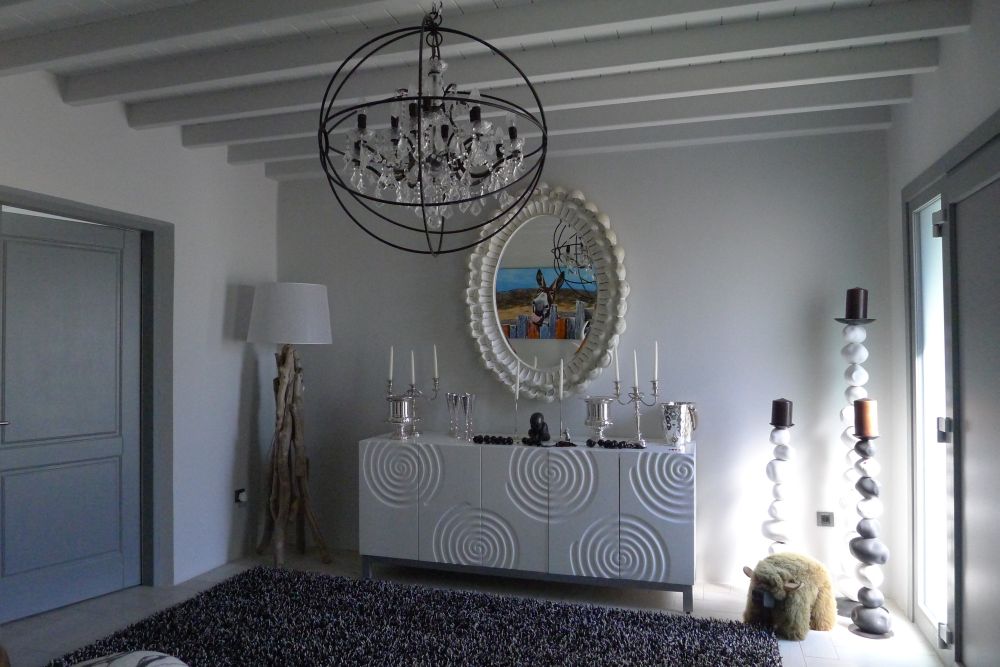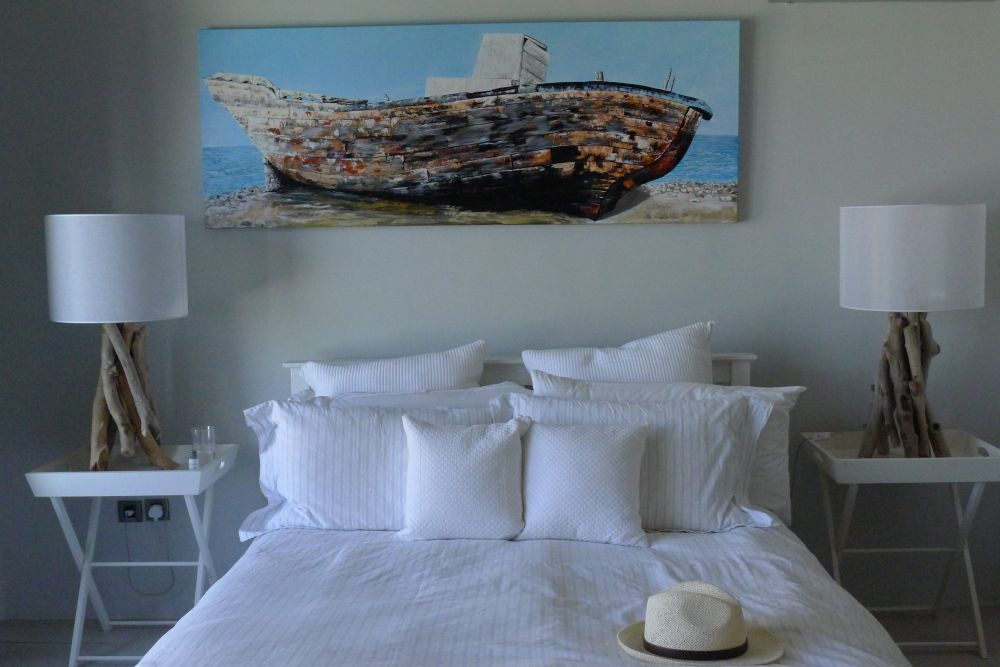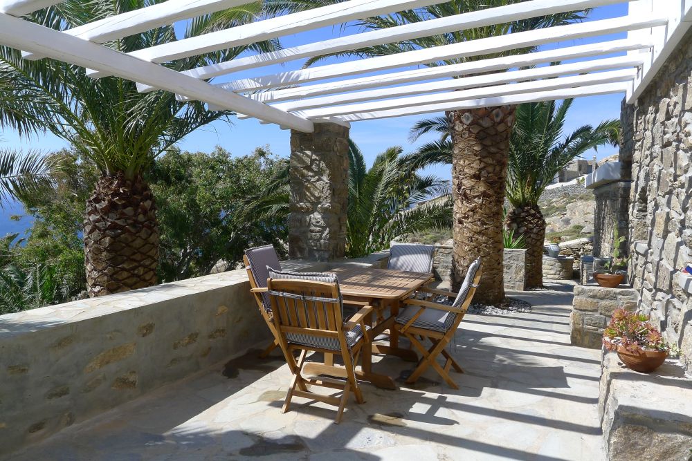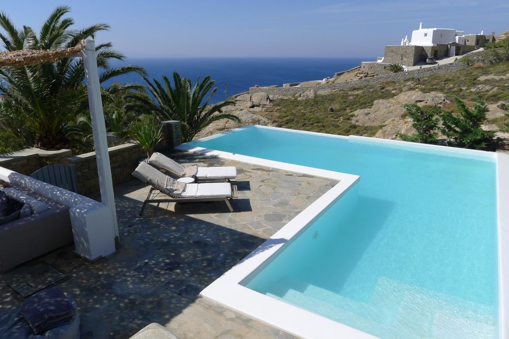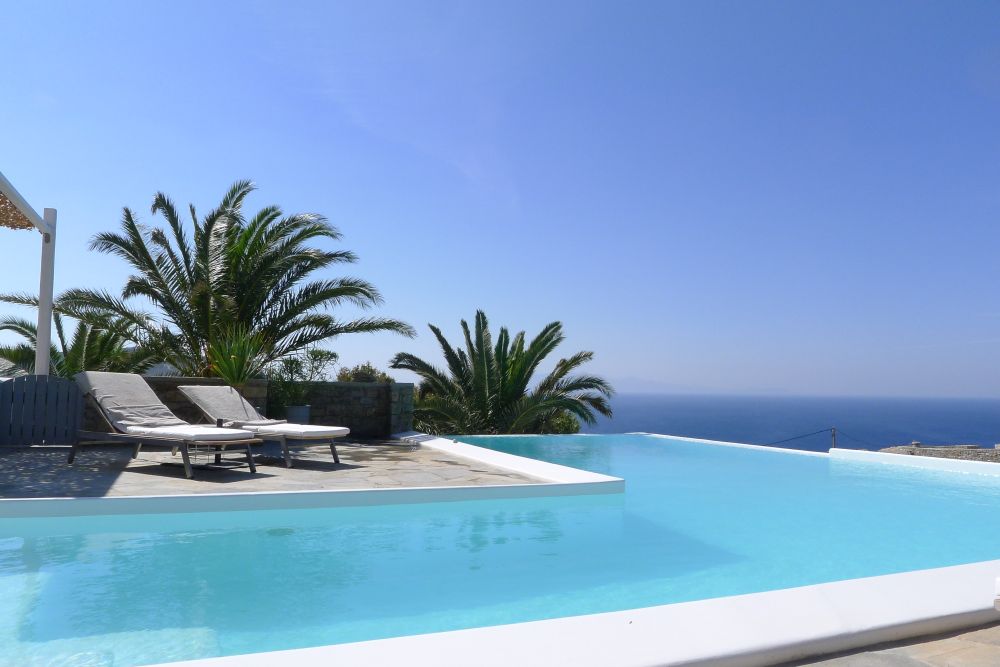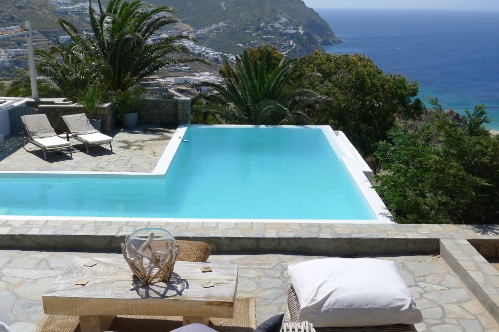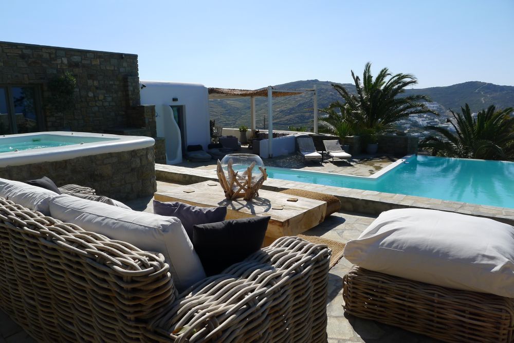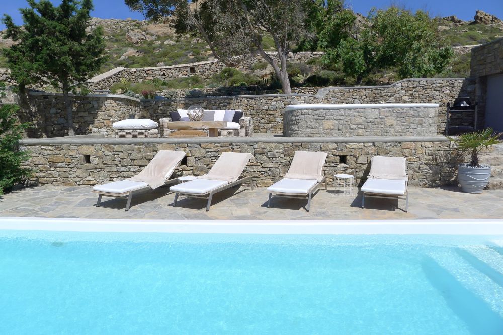 Villa Elia Bay is situated in the south part of Mykonos Island, on a private terraced estate overlooking the Aegean Sea, offering breath-taking views of Naxos and Donousa Islands in the background. Elegantly designed and furnished, this Mykonos Grand Villa is located on a hillside, overlooking Elia Bay. This villa on Mykonos harmoniously combines the smooth lines of its interior spaces with the rough stone surfaces of the exterior spaces and the surrounding landscape.