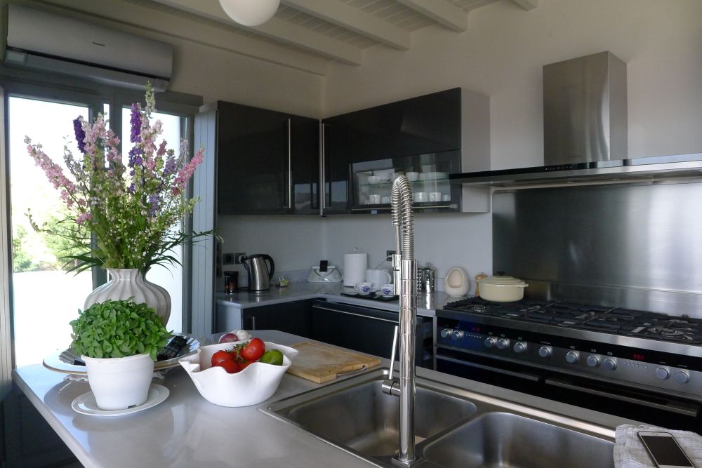 Villa Elia Bay welcomes our guests into an elegant foyer that leads to the main villa living quarters. An elegant, lounging and dining area with off-white walls, solid tile floors and wood beamed ceilings and a fully equipped open plan kitchen, exits to a pergola shaded terrace, suitable for al fresco dinning. Being the favorite gathering spot for our guests throughout the day it also provides access to the pool terrace beside it. The master bedroom, located across from the main entrance, spacious with a king size bed and en-suite, exits to a split level terrace with a Jacuzzi and a pool. A second guest bedroom with a king size bed, and en-suite, exits to a wooden balcony and is perfect for a couple that wishes to have privacy. Descending from the pool terrace, chiseled stoned steps lead down to the lower, garden level of the villa where two more bedrooms are located, each with an independent entrance and en-suite. One, with twin single beds (joinable), is suitable for singles or a couple, while the other bedroom has a king size bed. Both levels offer magnificent, uninterrupted views of Elia Bay and the Aegean Sea.