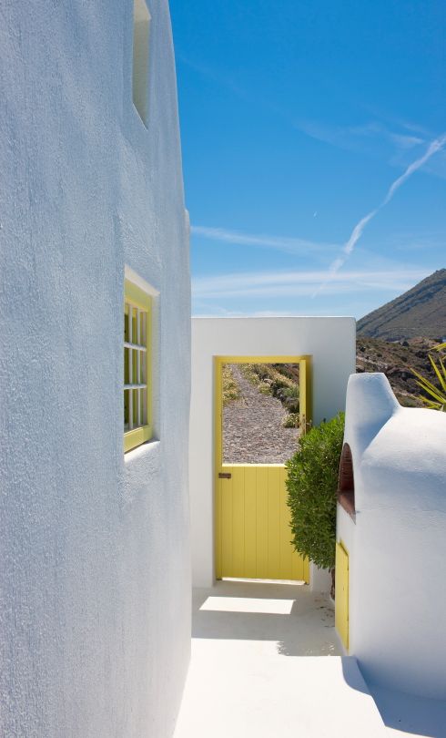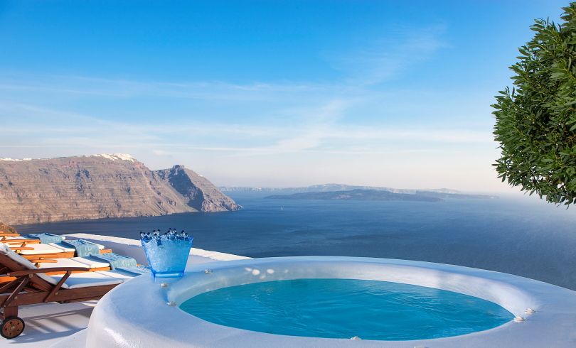 Departing from the provincial road of Firon - Oia and following a cobble stone drive, guest arrive and access the main villa entrance by crossing a sensational garden terrace featuring a tiled pool, a heated Jacuzzi, an outdoor lounging/ dining area and a magnificent view of the Santorini Archipelago.