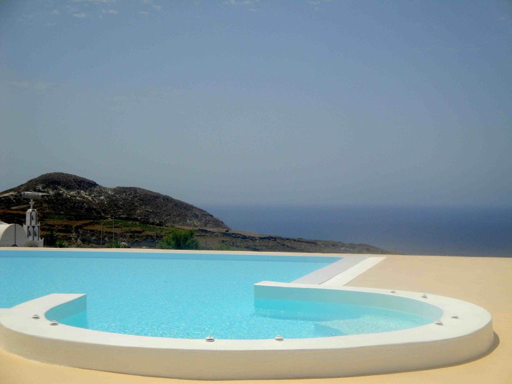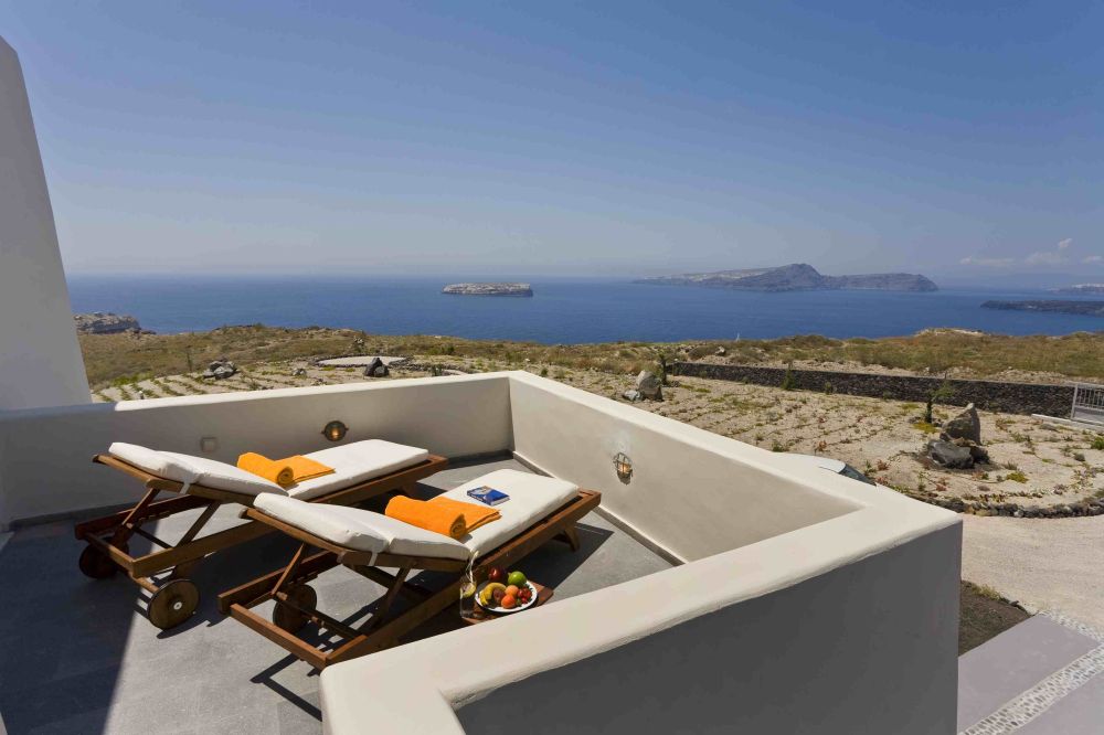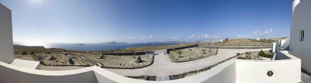 Villa Kallisti, located on the southwestern tip of the island, is situated in the comfortably secluded and strictly residential area of Messa Pigadia between the village of Akrotiri and the famous Akrotiri Lighthouse. Set on the plateau, this crown jewel among our collection of villas for rent on Santorini Island, offers guests a striking view of the Santorini Archipelago (island group) with Palea and Nea Kameni Islands at the center of the flooded volcanic basin, the uniquely inhabited Santorini Caldera to the north and the Sea of Crete to the south.