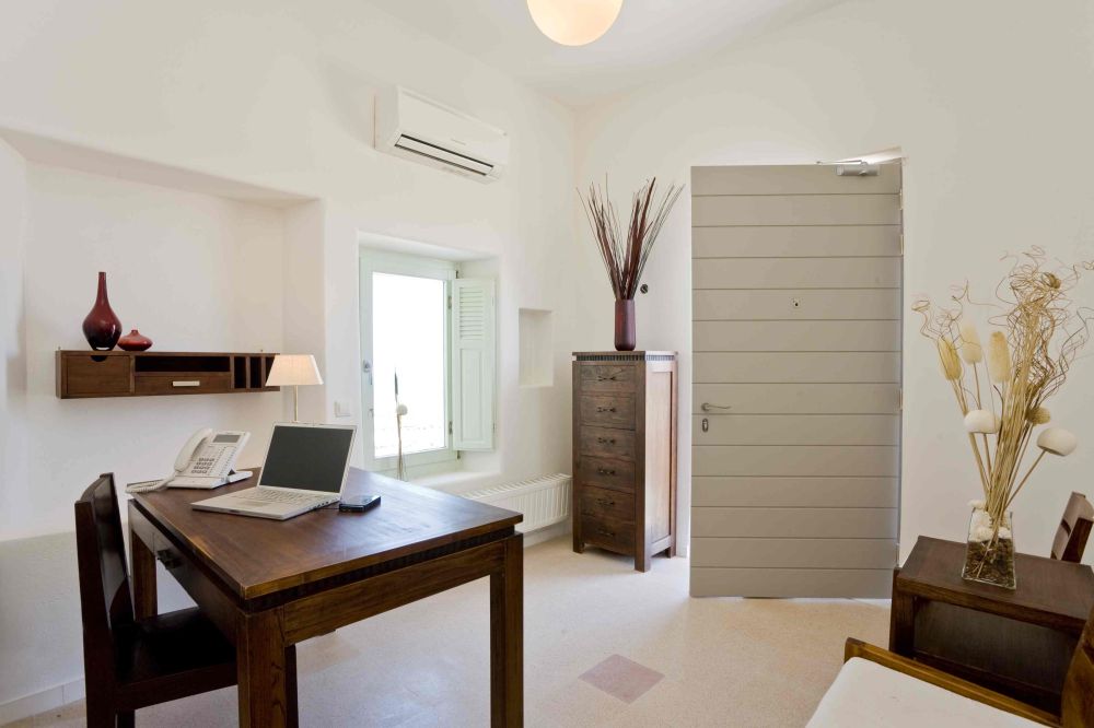 Built in traditional Cycladic architectural style, Villa Kallisti offers our guests ample indoor and outdoor spaces providing for privacy and serenity. Its interior design is modern, while earth tone colours and pale wood create a casual and tranquil ambiance. Guests are welcomed into the villa through a fully operational office /receptionarea, beyond which an internal stairwell in the central hall, provides access to the sleeping quarters and a large, submerged, recreational room. The five (5) spacious bedrooms with large double beds and stunning views of the surrounding environs, all en-suite, are located on three separate levels. Those on the lower levels exit to a various garden terraces and verandas, while the top level bedroom exits to a veranda overlooking the neighboring vineyards and with a most spectacular view of the sunset. Located on the entry level, the main living room with a dining area, luminous and spacious, and adjacent open plan kitchen, fully equipped and fully functional, exit to the main, pergola shaded veranda. Overlooking the heated pool and Jacuzzi, and with a splendid view of the Sea of Crete, this veranda is ideal for outdoor dining, anytime of the day, while the four decked terraces each located on a different side of the villa, provide guests with ample outdoor space to sunbathe, dine or just relax in a realm the vast blue where the Aegean Sea meats the Cycladic sky. Beyond the main living room, this very unique five star villa for rent on Santorini houses a state of the art sound recording studio suitable for tracking and mixing, available upon request. An in-house Assistant Engineer is always available.
